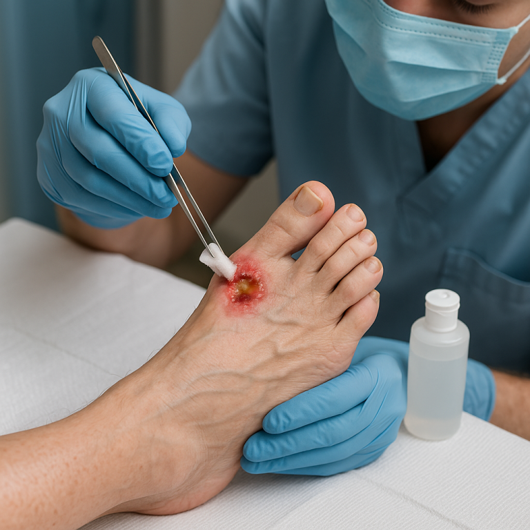 ראשית, יש לנקות את האזור בעדינות עם סבון ומים, ולאחר מכן לחטא בחומר אנטיספטי. טיפול בזיהום ברגל כולל גם שימוש בחבישות מיוחדות המסייעות בהגנה על האזור המודבק.